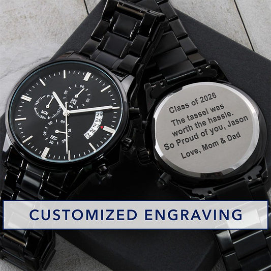 Mens Custom Watch Personalized Engraved Black Chronograph
